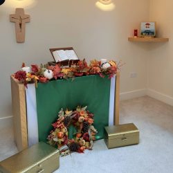 The chapel reflects the seasons of the Church — with Mary brought forward for devotion in October and May, a crib at Christmas, and special Lenten and Easter displays. Pupils visit with their teachers at key liturgical times, while Pupil Chaplains lead younger children in prayer on a rota basis during lunchtimes. Older pupils are also welcome to visit independently for quiet reflection.