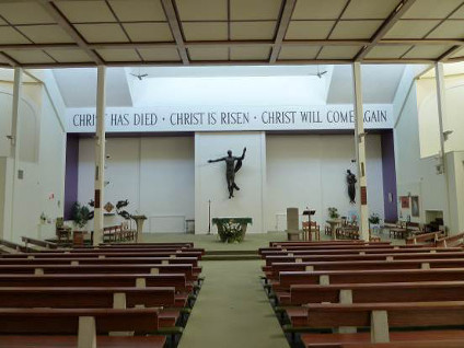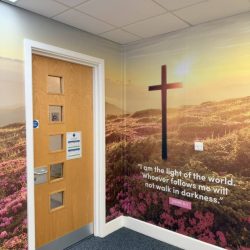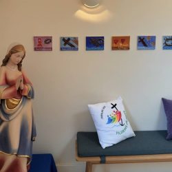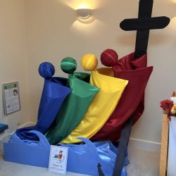 A beautiful stained-glass window, designed with children’s input, fills the space with colour and light. The walls are also decorated with the Stations of the Cross, again, designed by our past pupils. From the outside, our Passionist school logo can be seen, symbolising our shared identity as a community rooted in compassion, faith and hope.