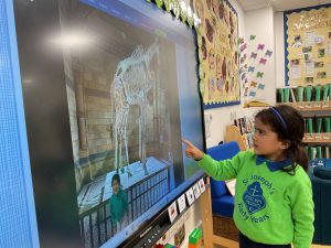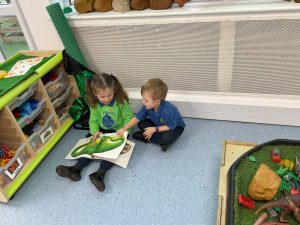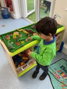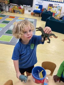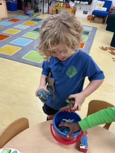 Our new theme is in fact ‘Megabeasts’, and the bucket of dinosaurs we found belongs to Harry from our key text: ‘Harry and the Bucketful of Dinosaurs’. We have already been sharing our own ideas and knowledge about dinosaurs – some of us have even visited museums to learn about them! We have also begun to create a dinosaur cave role play area.