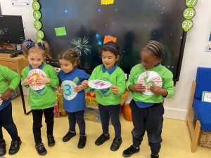 The children have also been sharing their experiences of autumnal celebrations and events. We have had lots of fun discussing firework displays, and we decided to capture our responses with a range of art activities, number rhymes and movement.