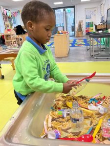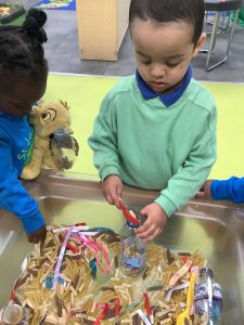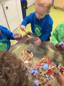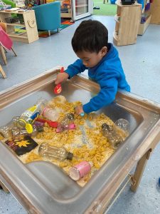 We have been strengthening our fine motor skills as well as our hand-eye- coordination by using our hands and different sized spoons to put rice and pasta into different sized bottles. It was lots of fun especially when the children learnt they could make different sounds when the bottles were filled.