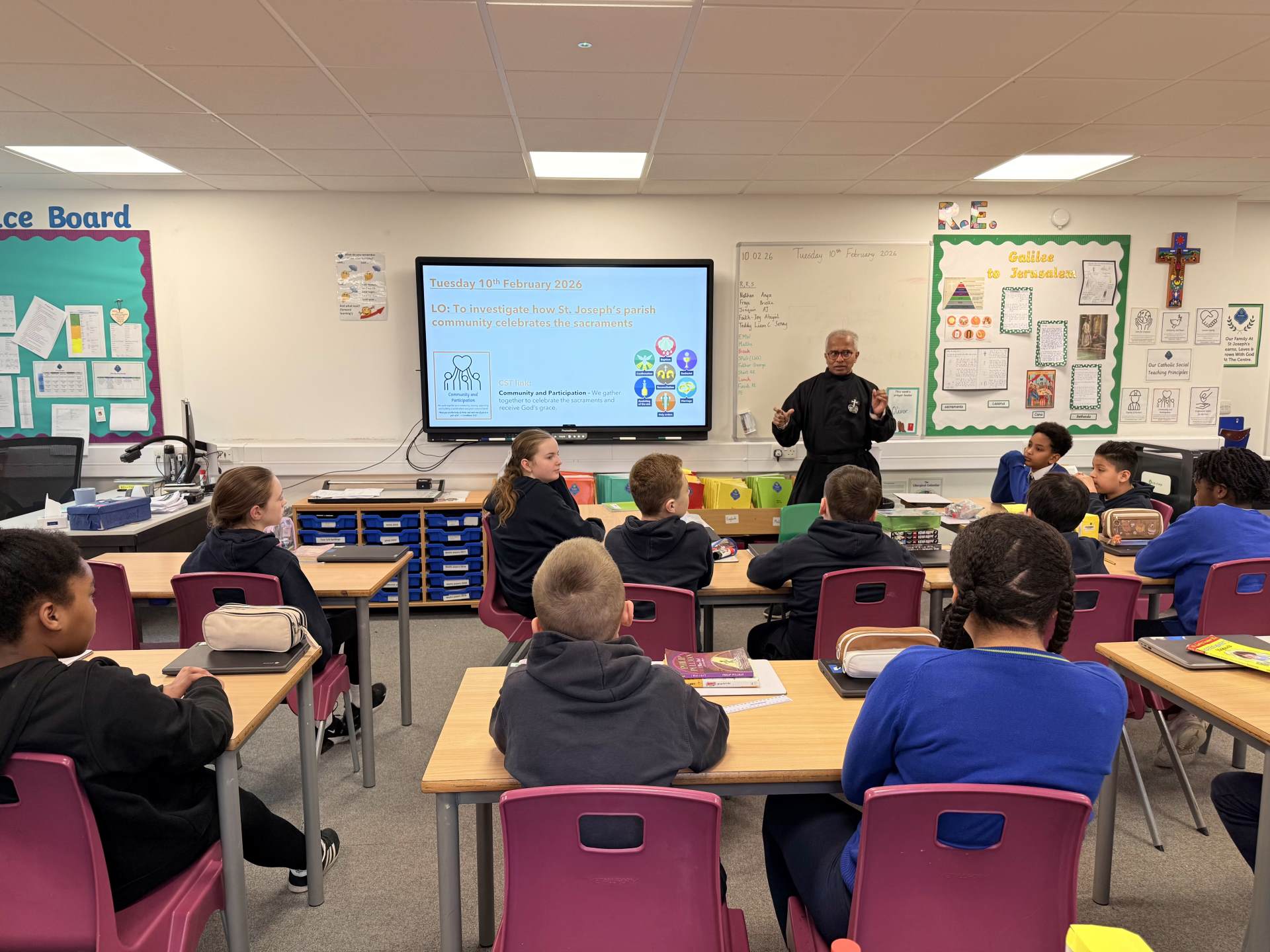 This week in RE, we were delighted to welcome Father George into school to help us conclude our learning from Branch 3: Galilee to Jerusalem. His visit gave the children a wonderful opportunity to deepen their understanding of the Church’s mission and the life of the sacraments. Over the past few weeks, the children have been exploring how Jesus’ ministry from Galilee to Jerusalem continues through the Church today. Father George spoke to the class in more detail about the seven sacraments and how they are lived out in parish life. The children had thoughtfully prepared a range of questions in advance, and he was so impressed with both their knowledge and curiosity.