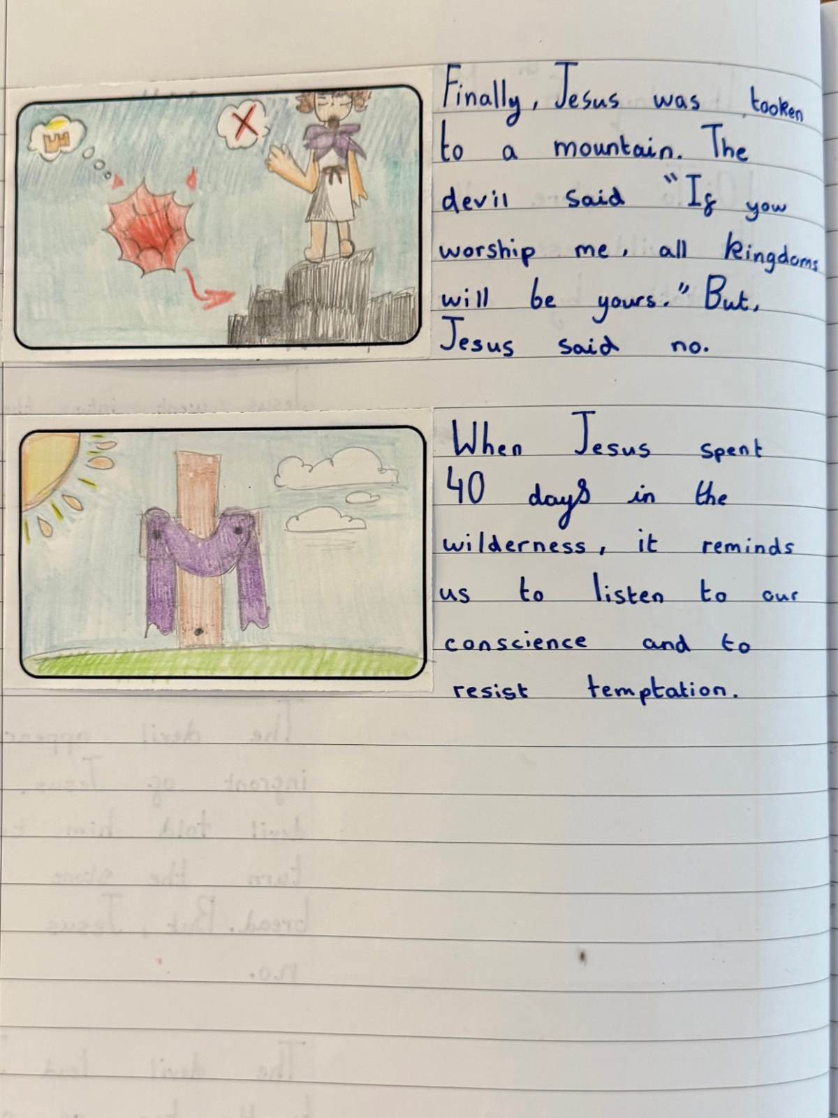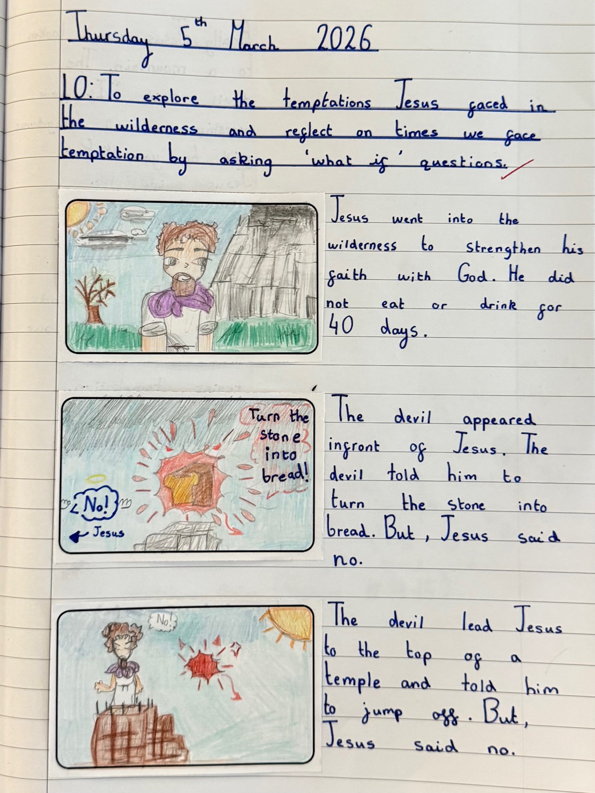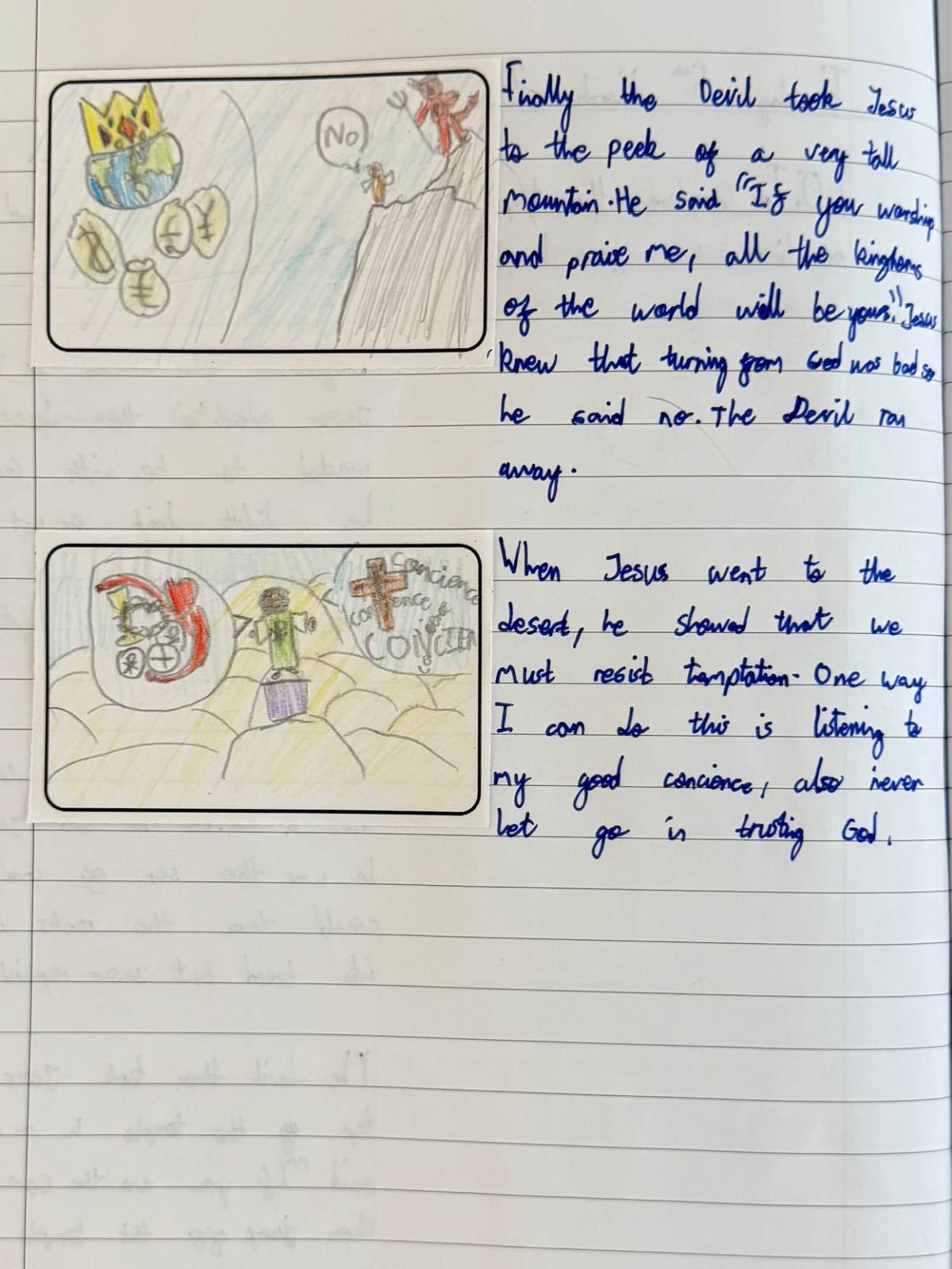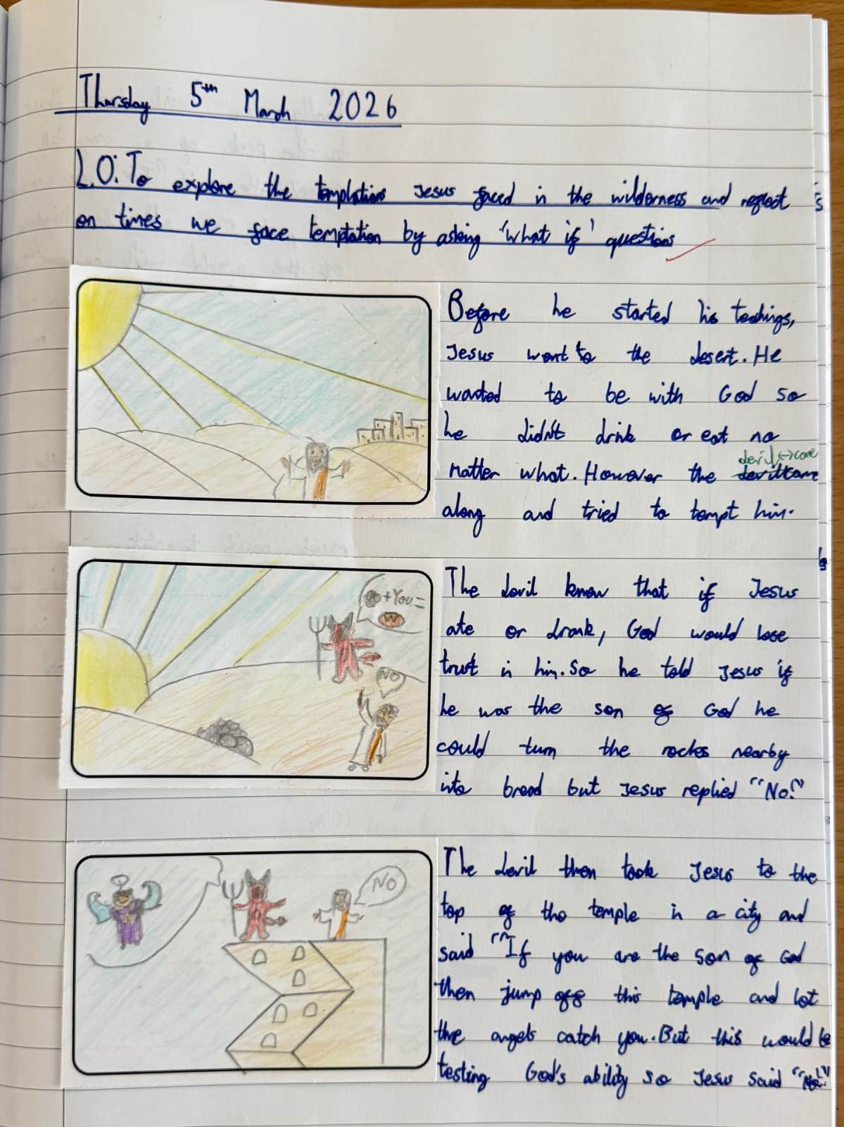 This week in Year 5, our RE learning began with the story of the temptations of Jesus Christ in the desert. The children explored how Jesus spent forty days in the desert and was tempted, yet chose to do what was right. We discussed how this story shows Christians the importance of making good choices, even when it might be difficult. To help bring the story to life, the children created their own storyboards. They illustrated key moments from the temptations and added captions to explain what was happening in each scene. This creative activity helped them think carefully about how Jesus responded to each temptation and what his actions teach Christians about faith, strength and making the right decisions.