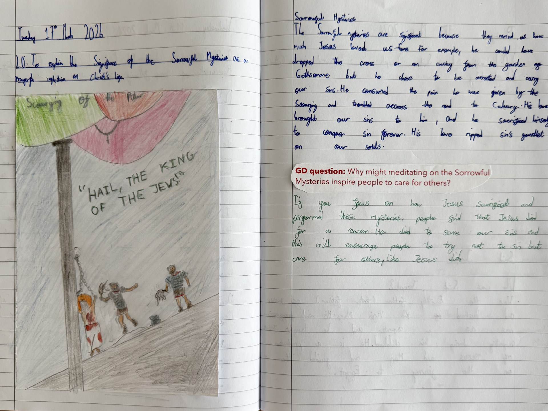 The pupils also explored the Sorrowful Mysteries of the Rosary, which help Catholics to remember the suffering and sacrifice of Jesus. They learned about each mystery, including events such as the Agony in the Garden and the Crucifixion. Through discussion, the children began to understand why these moments are important in the life of Jesus and what they teach Christians about courage, forgiveness and love. To express their understanding, the children created artwork inspired by the Sorrowful Mysteries. They carefully thought about how to represent the emotions and meaning behind each event, using colour and symbolism to show their ideas.