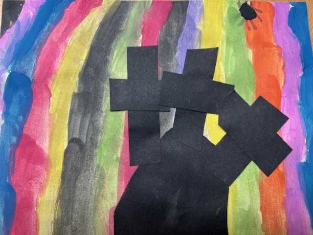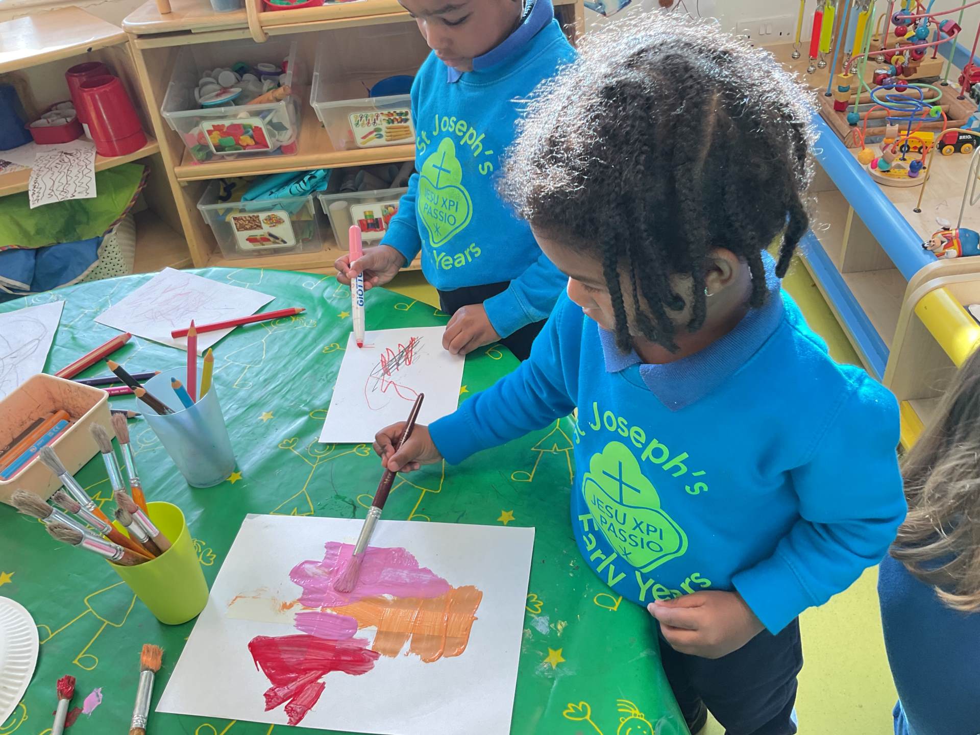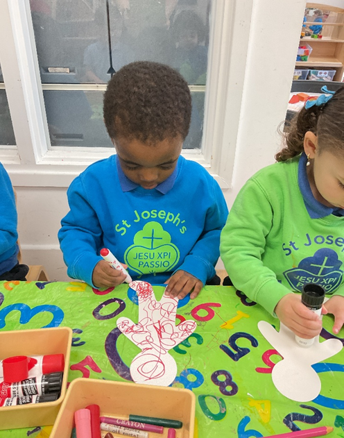 This week, we recapped and discussed important events we have previously learned about, including Palm Sunday and Holy Thursday. We then focused on Good Friday, which is a sad day but leads to a joyful event. We talked about how Jesus died on the cross and how his friends felt very sad. We also reflected on how much Jesus loved everyone and how, because of this great love, he was willing to give his life for others. The children explored how the cross is an important symbol that helps us remember and think about Jesus. We then spent some time to reflect on Jesus and gather our thoughts and prayers in a peaceful, still and calm environment. To finish, the children created their own crosses. They used paint, colours, and tissue paper to design special crosses to remind them of Jesus.