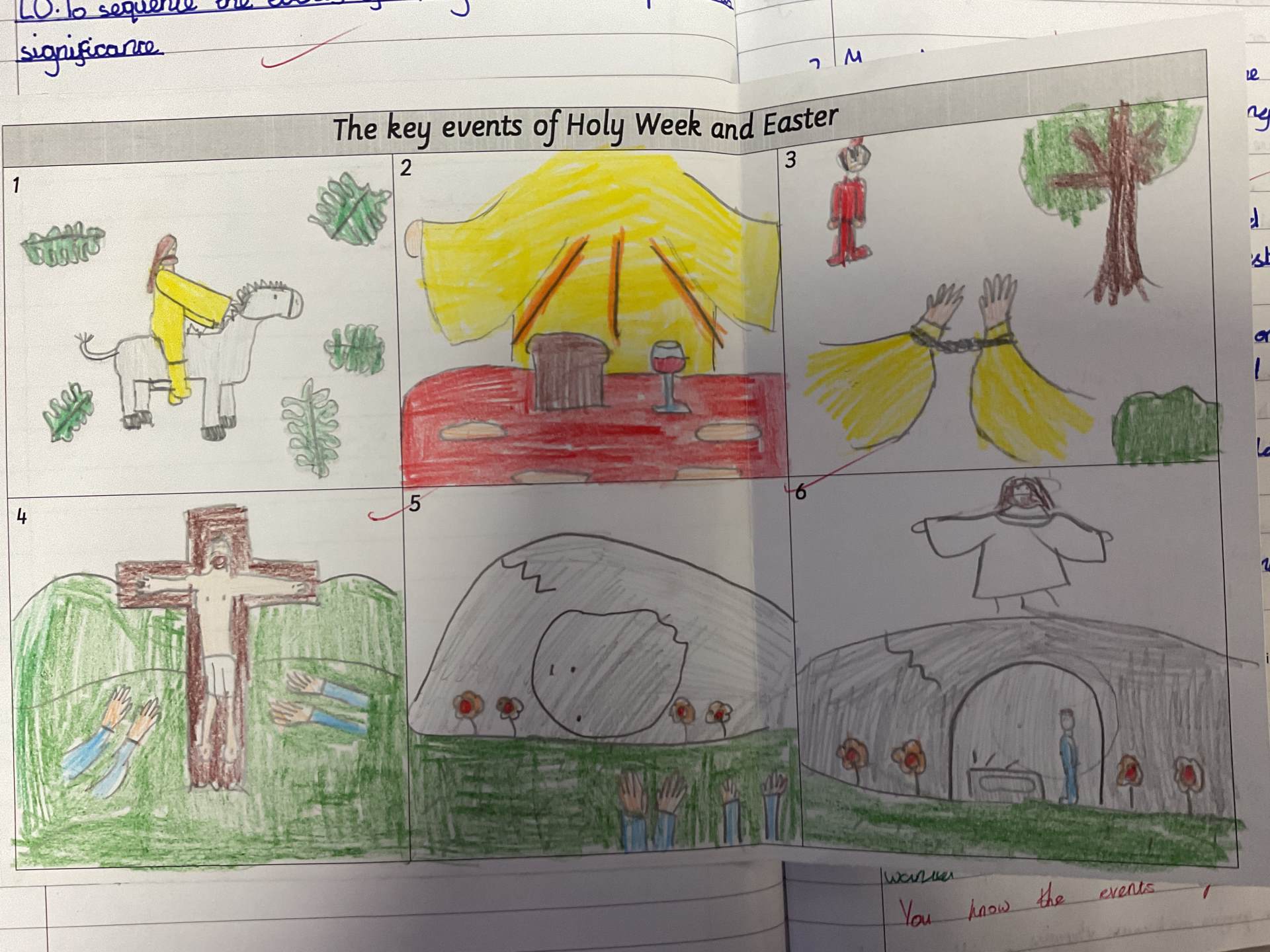 In our recent RE lessons, Year 6 have been exploring important moments from the final part of Jesus’ life and thinking carefully about their meaning. In our first lesson, we learned about the Stations of the Cross. These are a series of 14 moments that help Christians prayerfully reflect on Jesus’ journey to the cross. Many Christians walk from one station to another in churches, pausing to think, pray and remember what Jesus experienced.discussed what was happening at each moment. After learning about them, the children created their own illustrated versions of the Stations of the Cross. For each station, they carefully drew the scene and wrote their own reflections. Their reflections showed thoughtful ideas about Jesus’ suffering, courage, kindness and love for others. It was wonderful to see the creativity and empathy in their work as they imagined the emotions and challenges Jesus faced along the way.