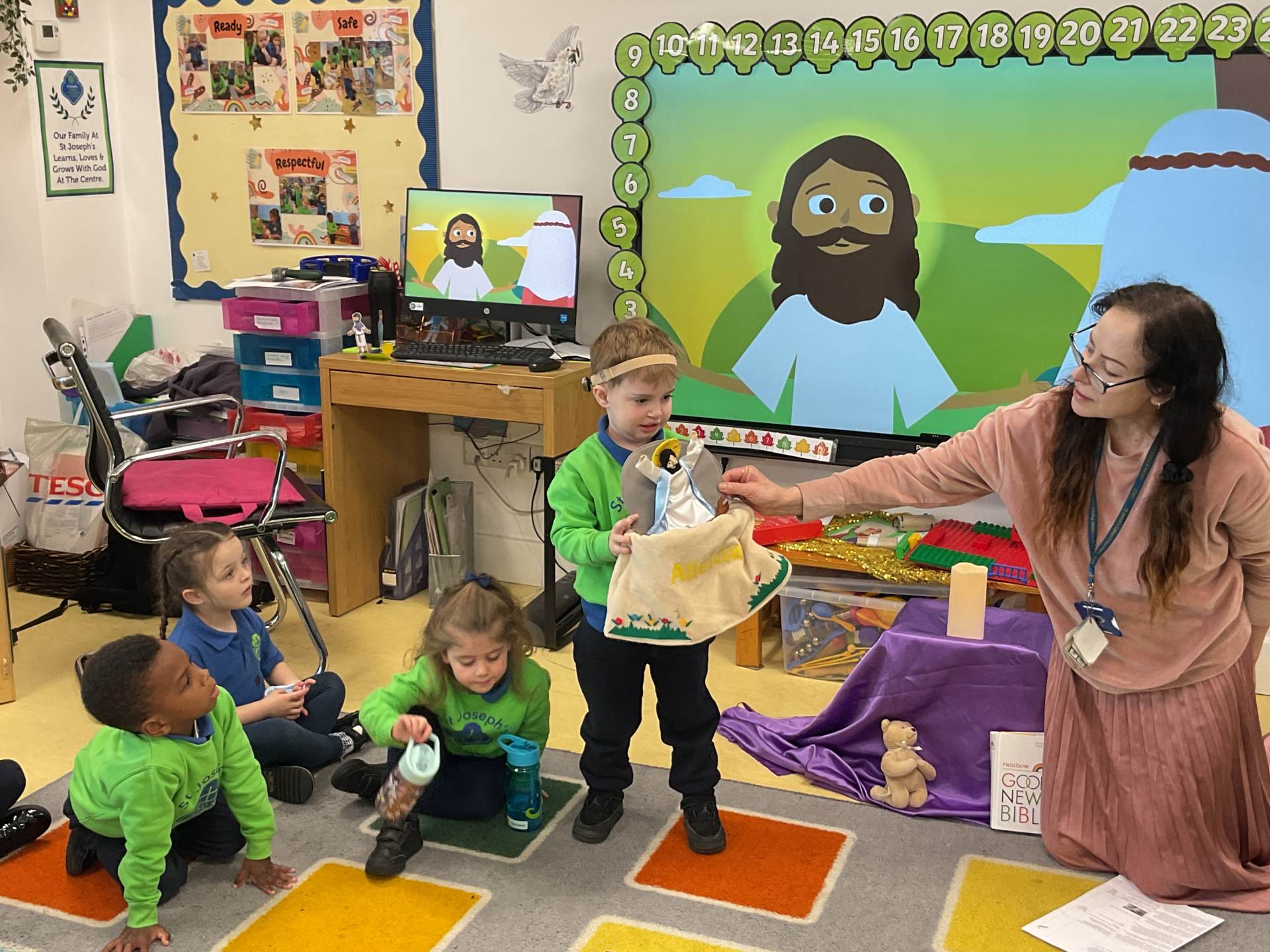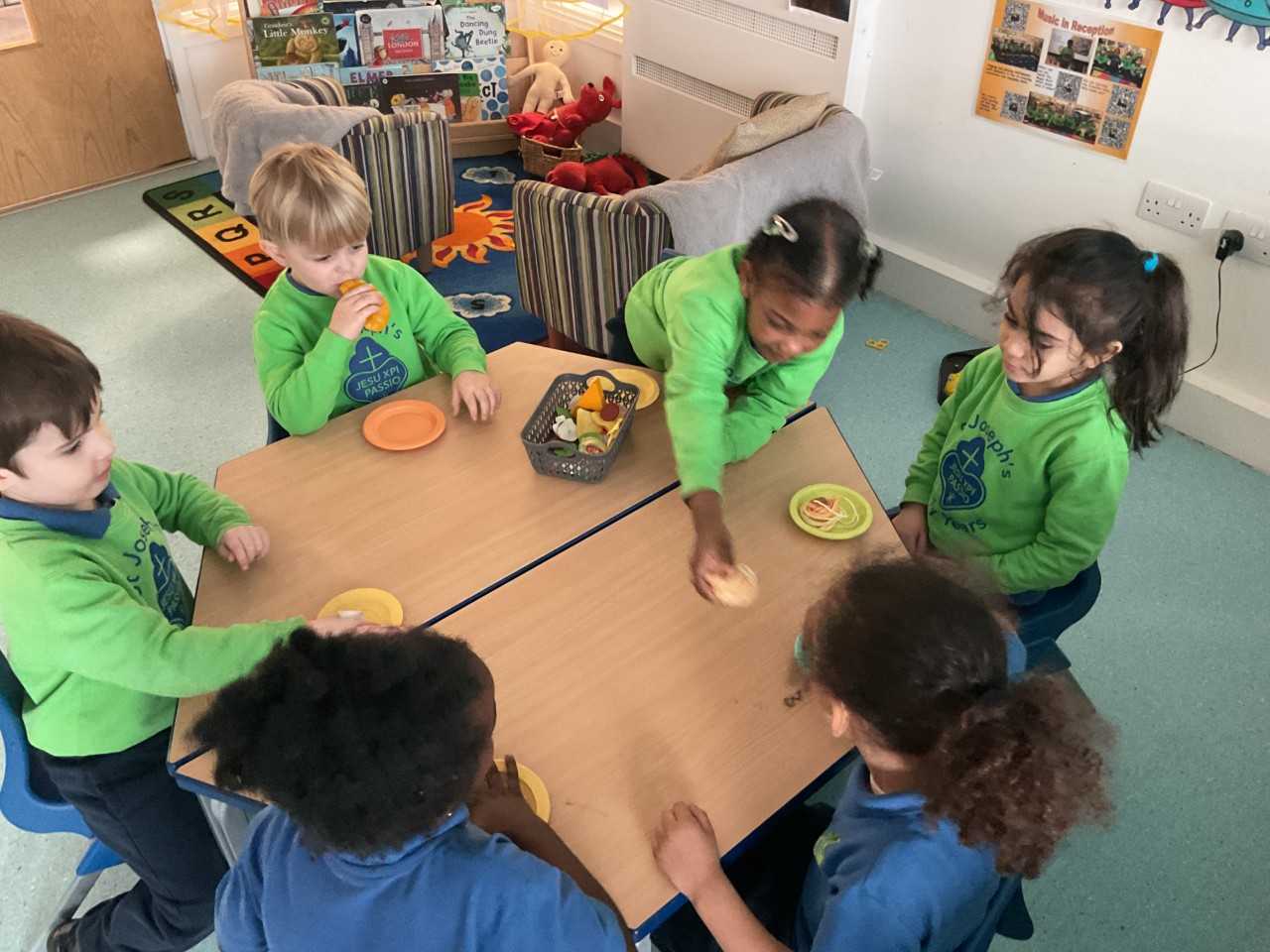 This week in Reception, we continued learning about Holy Week, the special time when Christians remember the final days of Jesus’ life. Last lesson the children learned about Palm Sunday, when Jesus entered Jerusalem and people welcomed him by waving palm branches. During this lesson, we introduced the next important day in Holy Week: Holy Thursday, when Christians remember a special meal Jesus shared with his friends. We listened to a story from Matthew 26: 17-30 and discussed how Jesus shared a meal with his friends, called disciples. During the meal, Jesus took some bread, thanked God, broke it, and shared it with them. He then shared a cup of wine and asked his friends to remember him and his love for them. To help the children understand the story, they pretended to sit around a table just like Jesus and his friends. Soft toy bread rolls and paper “bread pieces” were passed around so the children could experience what it might have been like to share a meal together. We finished by thinking about what this story teaches us. Jesus told his friends to love and care for one another, and we talked about how we can do the same in our classroom. The children shared lovely ideas about how they can show kindness, such as: sharing toys, taking turns, helping a friend and using kind words.